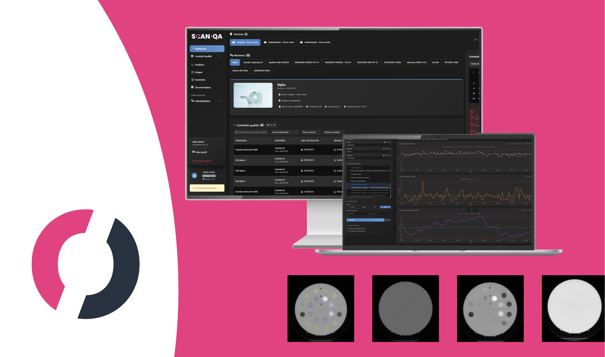Nos solutions sont conçues par et pour les physiciens médicaux. Elles répondent aux exigences réglementaires les plus strictes (ANSM) tout en intégrant les contraintes du terrain : hétérogénéité du parc, gestion multi-sites, continuité des données.
