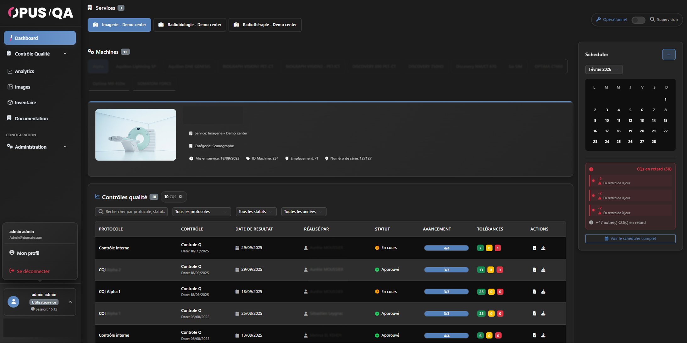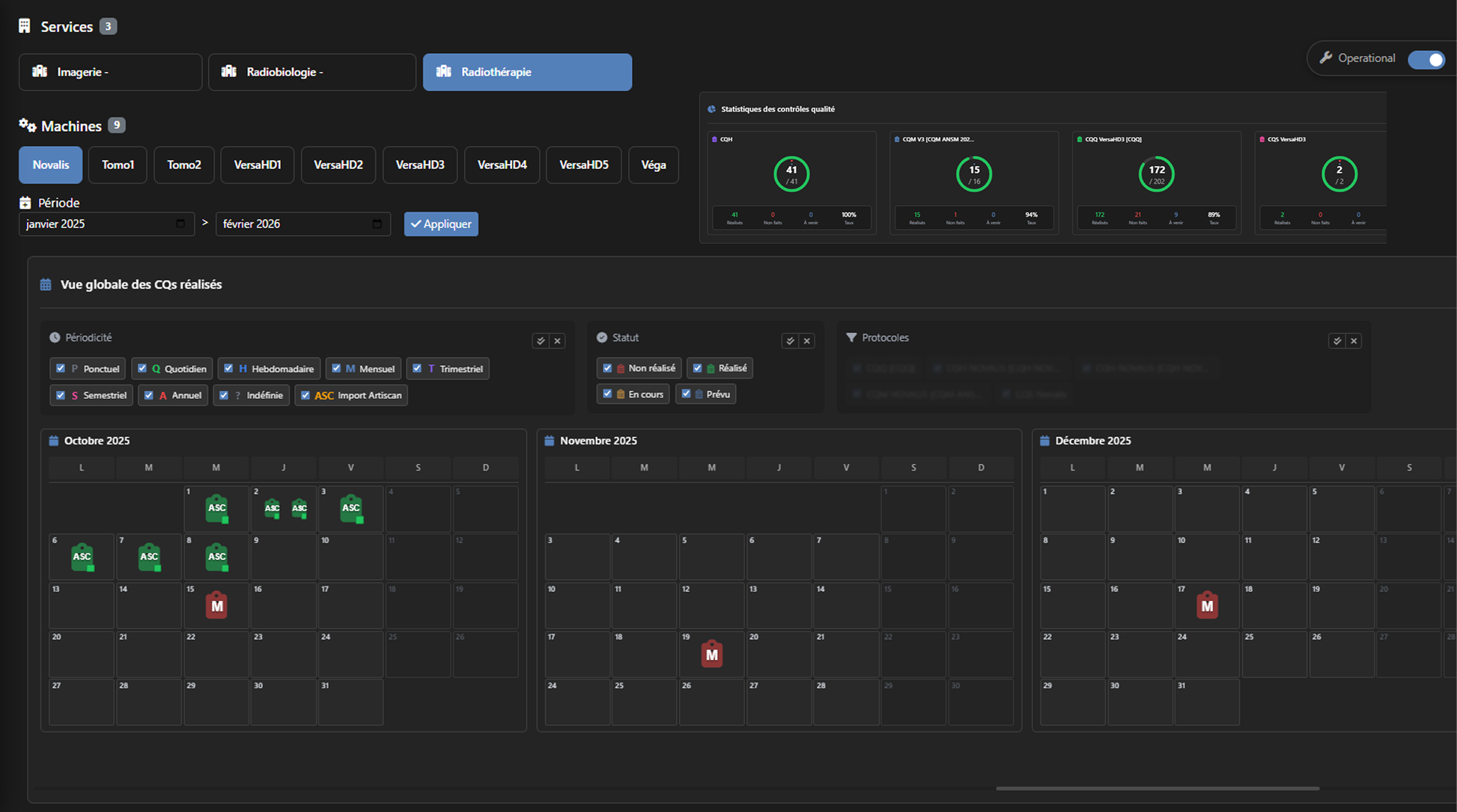 Tableau de bord personnalisable avec widgets modulaires. Idéal pour les responsables qualité et les physiciens responsables. Filtrable par service, machine et période.